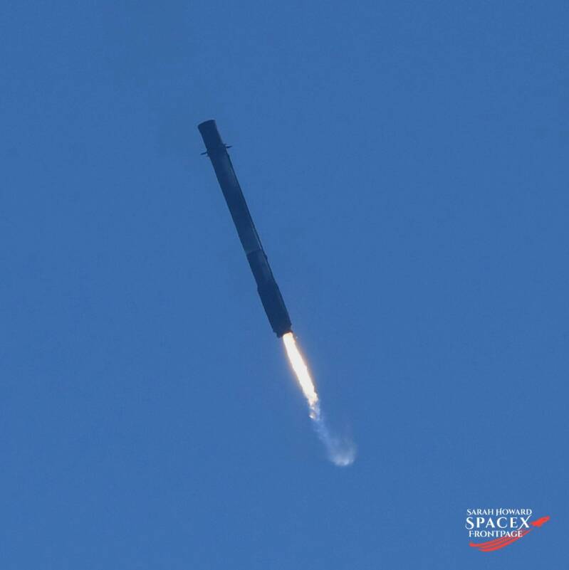 Separation occurred 2:20 seconds after liftoff. As the second stage ignited its lone engine moments later, the first performed a flip maneuver then a boost-back burn. Grid fins and cold gas thrusters aligned the descending stage. Six minutes after launch, three engines ignited for the