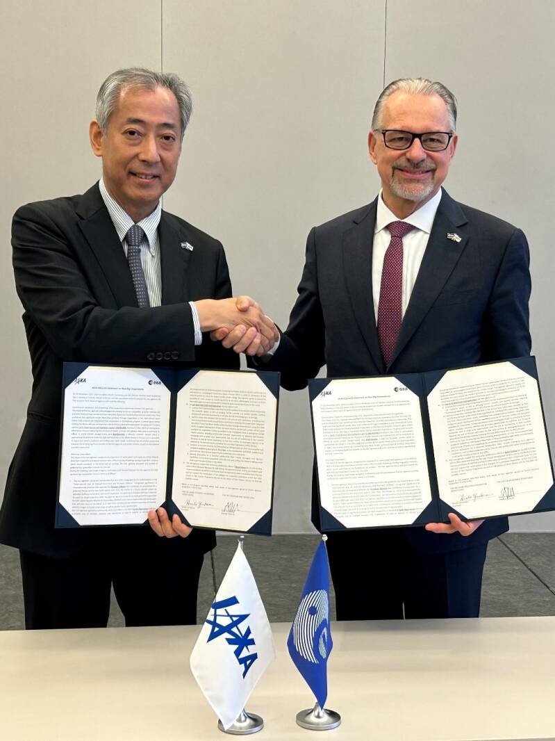 JAXA President Dr. Yamakawa Hiroshi (Left) and ESA Director General Dr. Josef Aschbacher (Right) Credit: JAXA