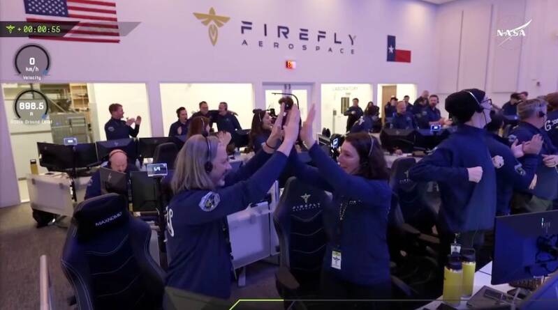Firefly Aerospace’s team in its mission operations center celebrates the successful touchdown of its first Blue Ghost lunar lander on the Moon on Sunday, March 2, 2025. Image: Firefly Aerospace via livestream