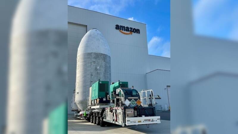 SpaceX transporting 24 Project Kuiper satellites inside its payload fairings from Amazon’s Payload Processing Facility at the Space Florida Launch and Landing Facility out to Space Launch Complex 40 (SLC-40) at Cape Canaveral Space Force Station. Image: Amazon